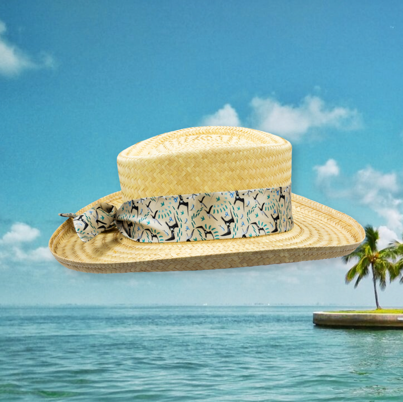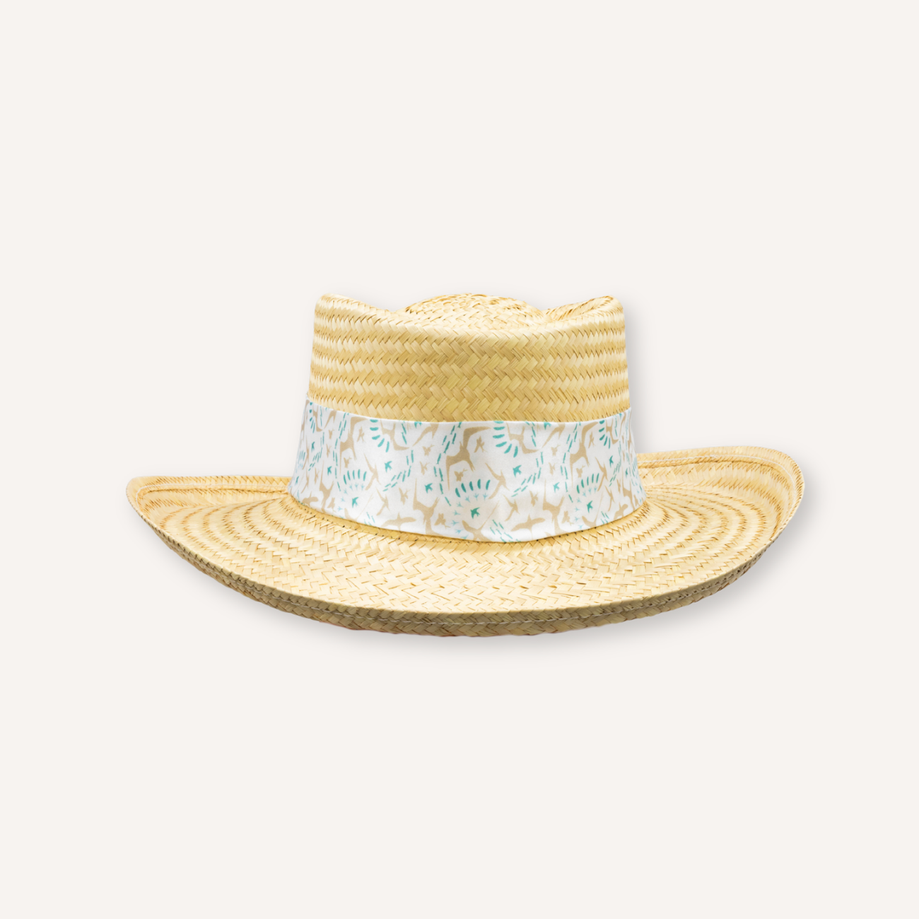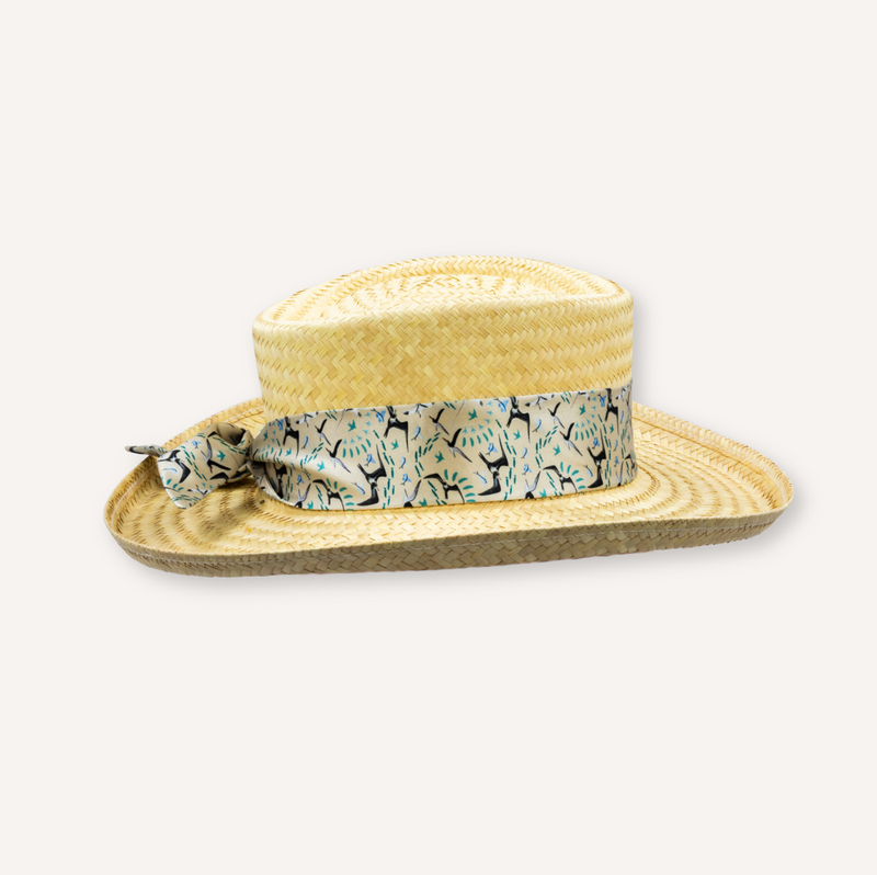 Made from woven palm leaf in the Oaxaca Valley of Mexico, The Biscayne features a 3.5 inch brim with a slight turn-up. Uniquely American, this gambler-style hat with it’s oval crown and sharp black hatband lend this hat an air of sophistication when paired with a hat twilly featuring custom hand-painted designs from artist Lindsey Simonds.