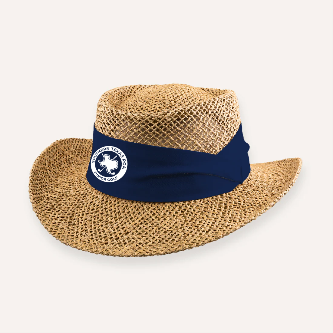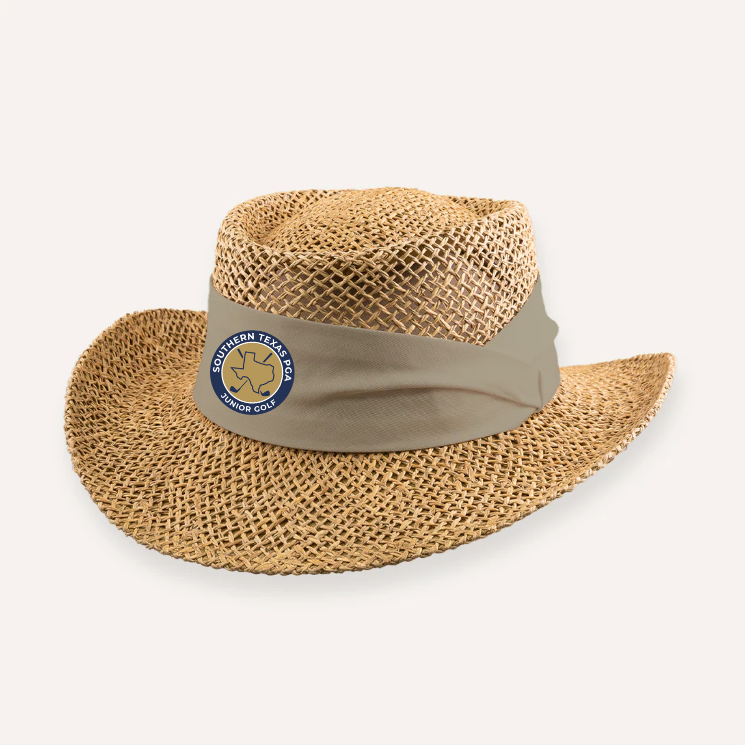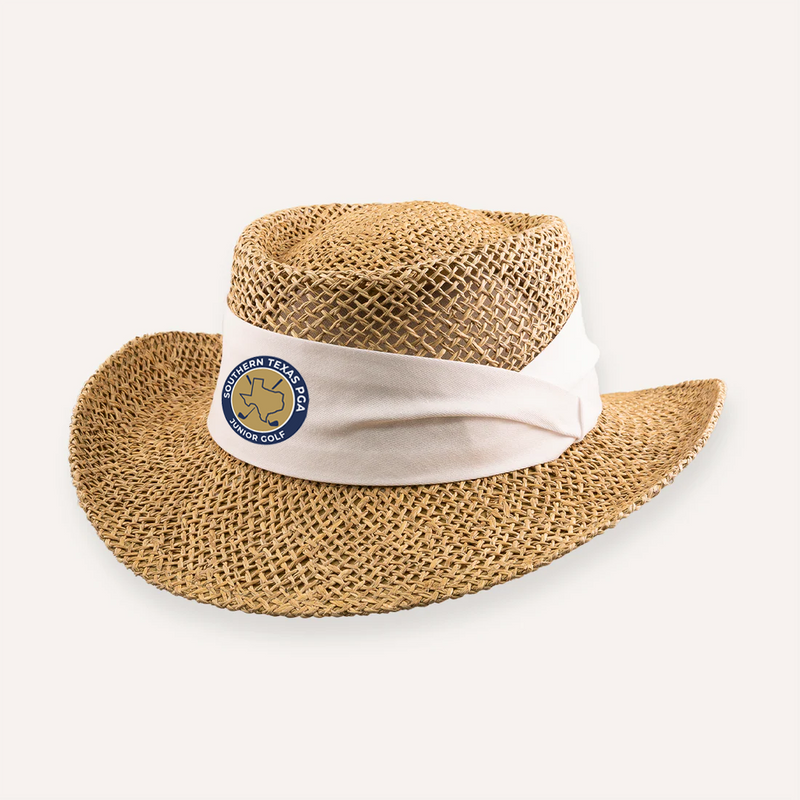This sophisticated straw hat features a twisted linen construction with a generous 3.25 inch brim for maximum sun coverage during long rounds. The classic pleated cotton band adds timeless appeal, while integrated sunblock material in the crown and under the brim keeps you protected from intense Texas heat. Whether you're working the fairways or supporting junior golfers, The Gambler delivers refined heritage-inspired design that performs when it matters most.
