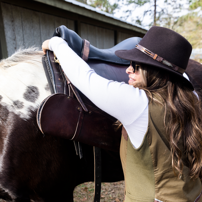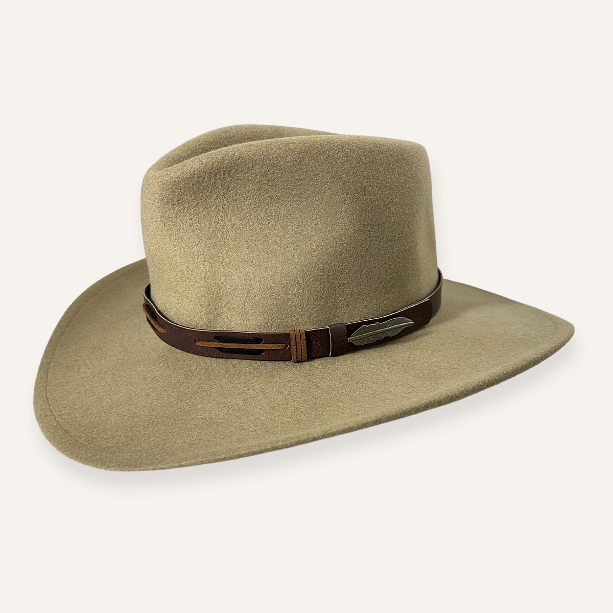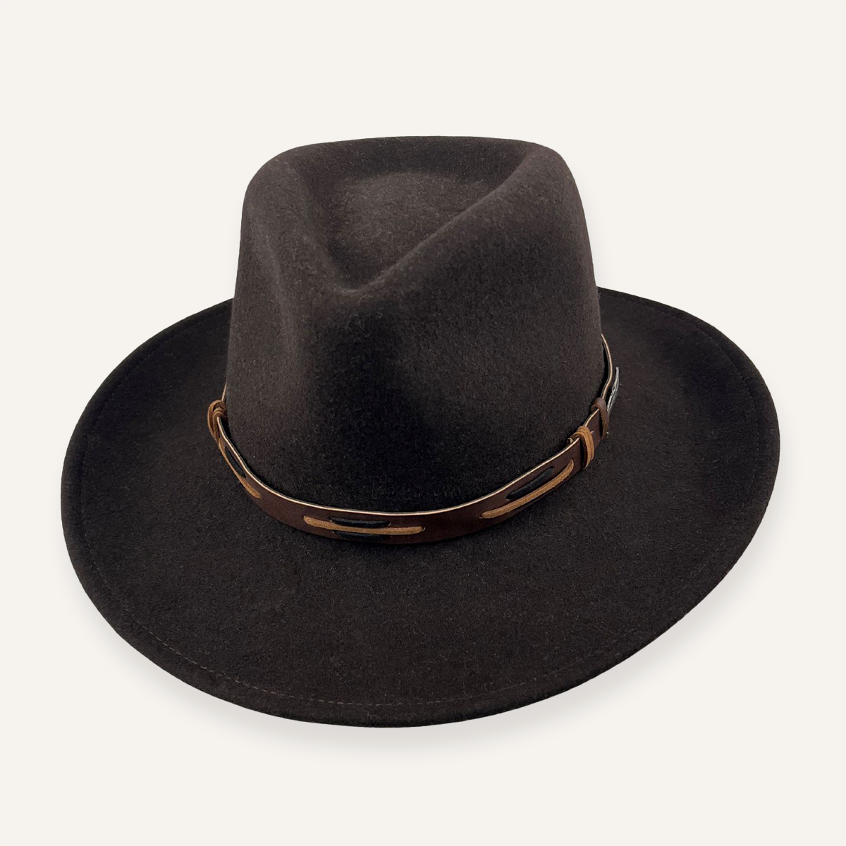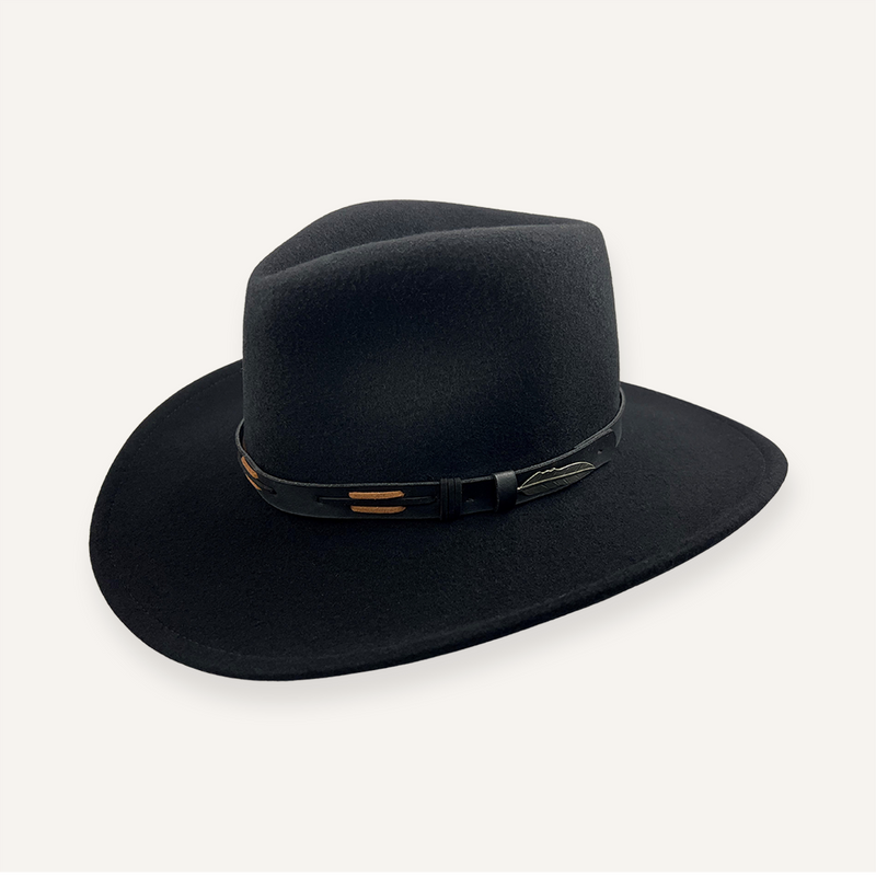 Crushable Wool Adventure Hat with a soft microfiber sweatband and leather hat band. This hat features a flexible 3 1/4″ brim with 2 forward dents. 100% Wool. Made in USA.